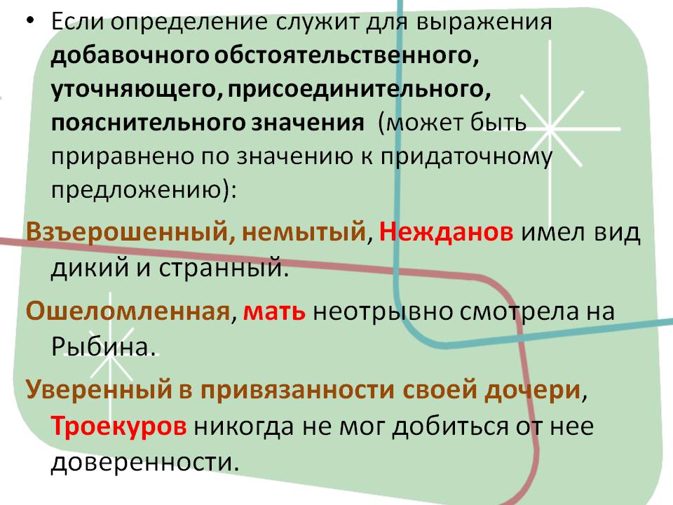 Если определение служит для выражения добавочного обстоятельственного, уточняющего, присоединительного, пояснительного значения (может быть приравнено по значению к придаточному предложению): Взъерошенный, немытый, Нежданов имел вид дикий и странный. Ошеломленная, мать неотрывно смотрела на Рыбина. Уверенный в привязанности своей дочери, Троекуров никогда не мог добиться от нее доверенности. Слайд 6 из презентации «Определение в предложении».